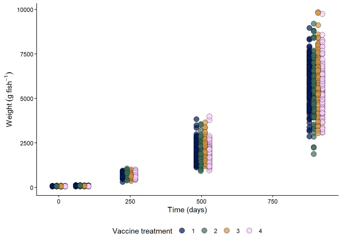 labs(y = expression(Weight~(g~fish^{-1})), x = "Time (days)")+
