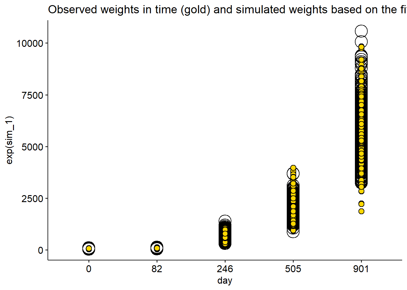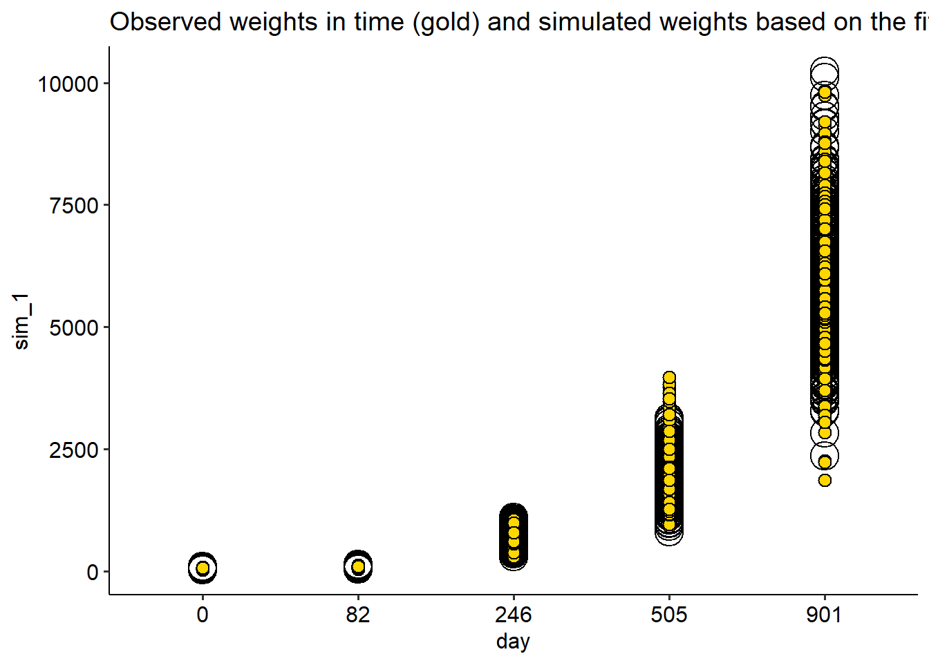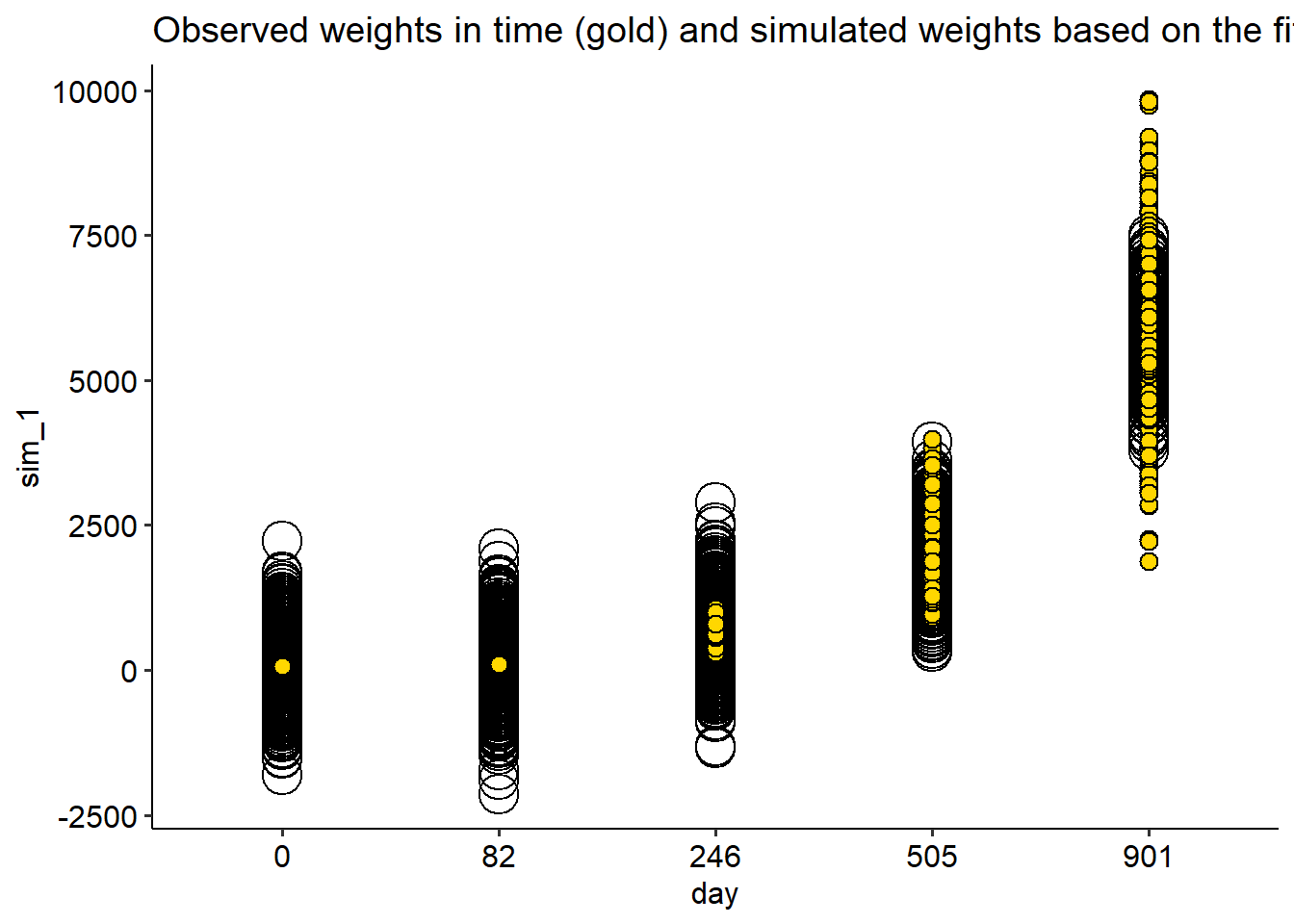 labs(title = "Observed weights in time (gold) and simulated weights based on the fitted Gamma model (open)")