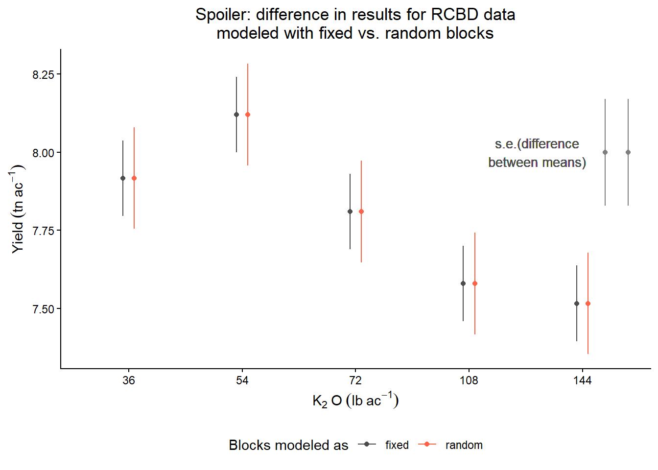 labs(title = "Spoiler: difference in results for RCBD data\nmodeled with fixed vs. random blocks",